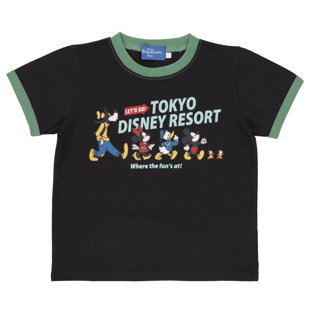 はじける笑顔と元気いっぱいのミッキーたちがデザインされたキッズ用のTシャツです。