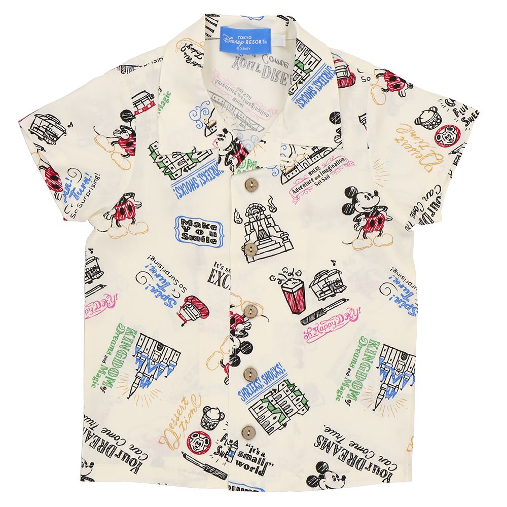 東京ディズニーランドのイッツ・ア・スモールワールドやシンデレラ城などのアトラクションとともに、ミッキーが手描き風に描かれている、キッズ用のアロハシャツです。