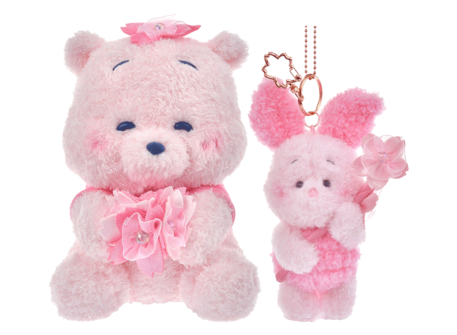 マーブルピンクで幻想的なカラーリングが特別感たっぷりのぬいぐるみは、チップ&デール、『くまのプーさん』プーさん、イーヨー、『くまのプーさん ザ・ムービー/はじめまして、ランピー!』ランピー、『おしゃれキャット』マリー、『リロ&スティッチ』スティッチ、『ダンボ』ダンボ、『モンスターズ・インク』マイク・ワゾウスキ、『フィニアスとファーブ』ペリー、店舗限定展開のドナルドダックの10種展開。ぬいぐるみキーホルダーは上記に加え、ピグレットもラインナップ。2キャラクターが縦に重なった姿が愛らしい「TSUM TSUM」のキーチェーンからはプーさん&ピグレット、スティッチ&スクランプ、『ベイマックス』ベイマックス&モチが和を感じるさくら色のデザインでお目見え。桜餅を頭に乗せたベイマックスと桜餅コスチュームがお似合いのモチがキュートな「うるぽちゃちゃん」、桜柄の着物姿が華やかなミッキー&ミニーのぬいぐるみ・ぬいぐるみキーホルダーも登場!