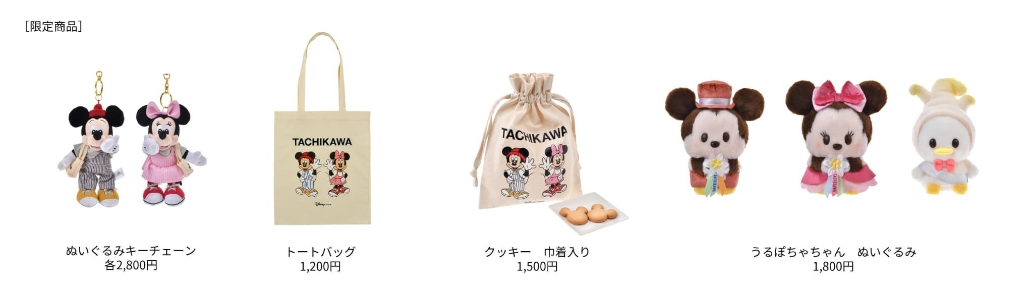 グランドオープンを記念して、ららぽーと立川立飛店限定アイテムを発売します。公園でのんびりしているミッキーマウスとミニーマウスをイメージしたカジュアルなコーディネートのぬいぐるみキーチェーンが登場。そのほか、“TACHIKAWA”の文字が映えるトートバッグ、巾着入りクッキーなど、ここでしか手に入らないスペシャルなアイテムをご用意しました。「うるぽちゃちゃん」からは、グランドオープンにふさわしいドレッシーな装いのミッキーとミニー、立川の名産品“うど”のコスチュームを身につけたドナルドダックがラインナップします。