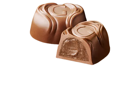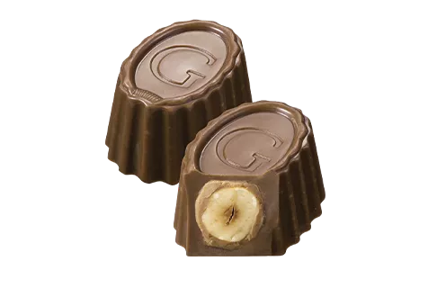 ヘーゼルナッツプラリネとまるごと入った1粒のヘーゼルナッツをミルクチョコレートで包みました。ヘーゼルナッツのカリっとした歯ごたえとなめらかなプラリネが、リッチな食感を楽しめるひと粒。