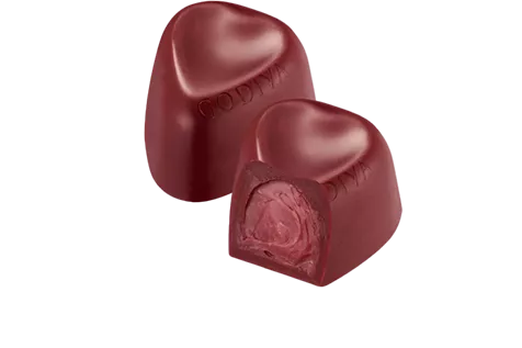 バーガンディーカラーのハート形のホワイトチョコレートにラズベリーガナッシュを閉じ込めた、甘酸っぱさを感じるひと粒です。