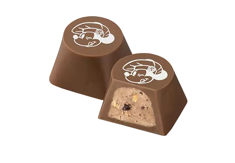 ディズニーストアオリジナルローストされたヘーゼルナッツとチョコレートチップがカリカリと楽しいヘーゼルナッツプラリネをミルクチョコレートで包み、ウインクしているミッキーをデザインしました。